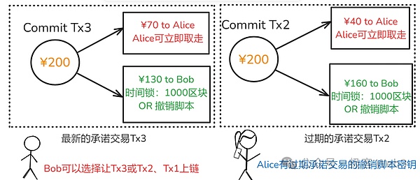 这里要提到一个叫“撤销密钥”的东西。假如Bob把过期的承诺交易提交上链,Alice可以通过撤销密钥把Bob应得的钱提走。