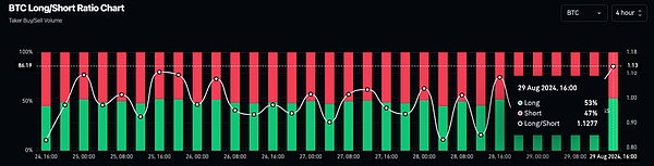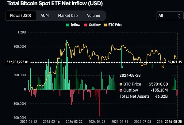 从Coinglass合约持仓量趋势变化观察,总体看多情绪略有优势,截至目前,做多比例53%、做空比例47%,多空比为1.13。当前总体恐慌情绪逐渐平稳,从8月13日到8月28日的12天里,9天净流入,3天净流出,整体呈现净流入趋势,累计流入4.78亿美元。