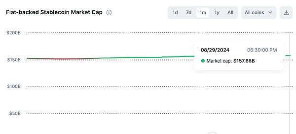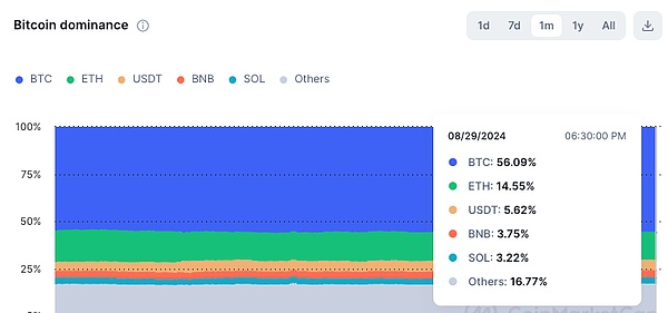 8月16日至9月1日,稳定币市值增长了26亿美元,增长了 1.6%。比特币占加密总市值比例略有上升,为 56.24%。