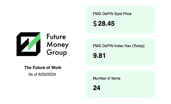 FutureMoney Group DePIN 指数是 FutureMoney 构建的 DePIN 优质组合代币指数,挑选了最具代表性的 24 个 DePIN 项目。相较于上次报告上涨9.8%,其中HNT和RENDER走势强劲,DePIN概念有反转向上的趋势。