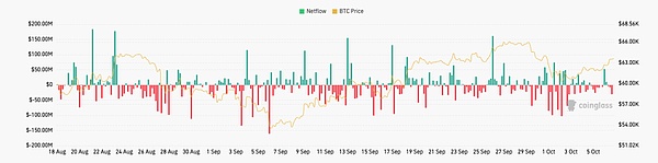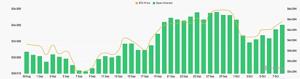 从Coinglass合约持仓量趋势变化观察,9月15日以来全网BTC合约未平仓头寸有所上升,从9月15日的309亿美元涨至340亿美元。9月15日至9月25日BTC合约持仓量经历第一轮上涨,涨至最高355亿美元,此后在10月1日开始大幅下跌,跌至318亿美元,并在国庆节末期开始继续回升。