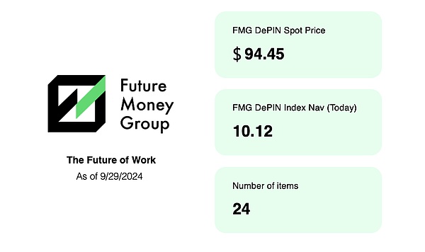 FutureMoney Group DePIN 指数是 FutureMoney 构建的 DePIN 优质组合代币指数,挑选了最具代表性的 24 个 DePIN 项目。相较于上次报告,NAV值有小幅度提升,从9.07涨至10.12;而Spot Price有大幅度增长,原因在于TAO代币的迅猛上涨。从此前300美元左右涨至600美元。