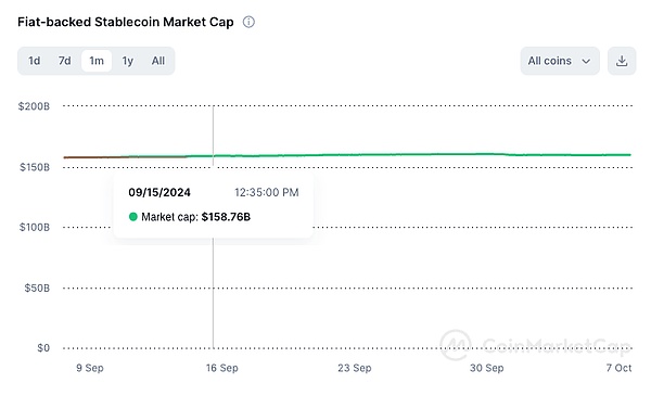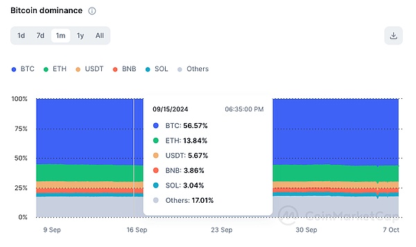 9 月 15 日至 10 月 7日,稳定币总体平稳,维持在1590亿美元左右。此外,BTC占加密货币总市值比例也总体平稳,较9月上旬有略微上涨,当前为56.57%。