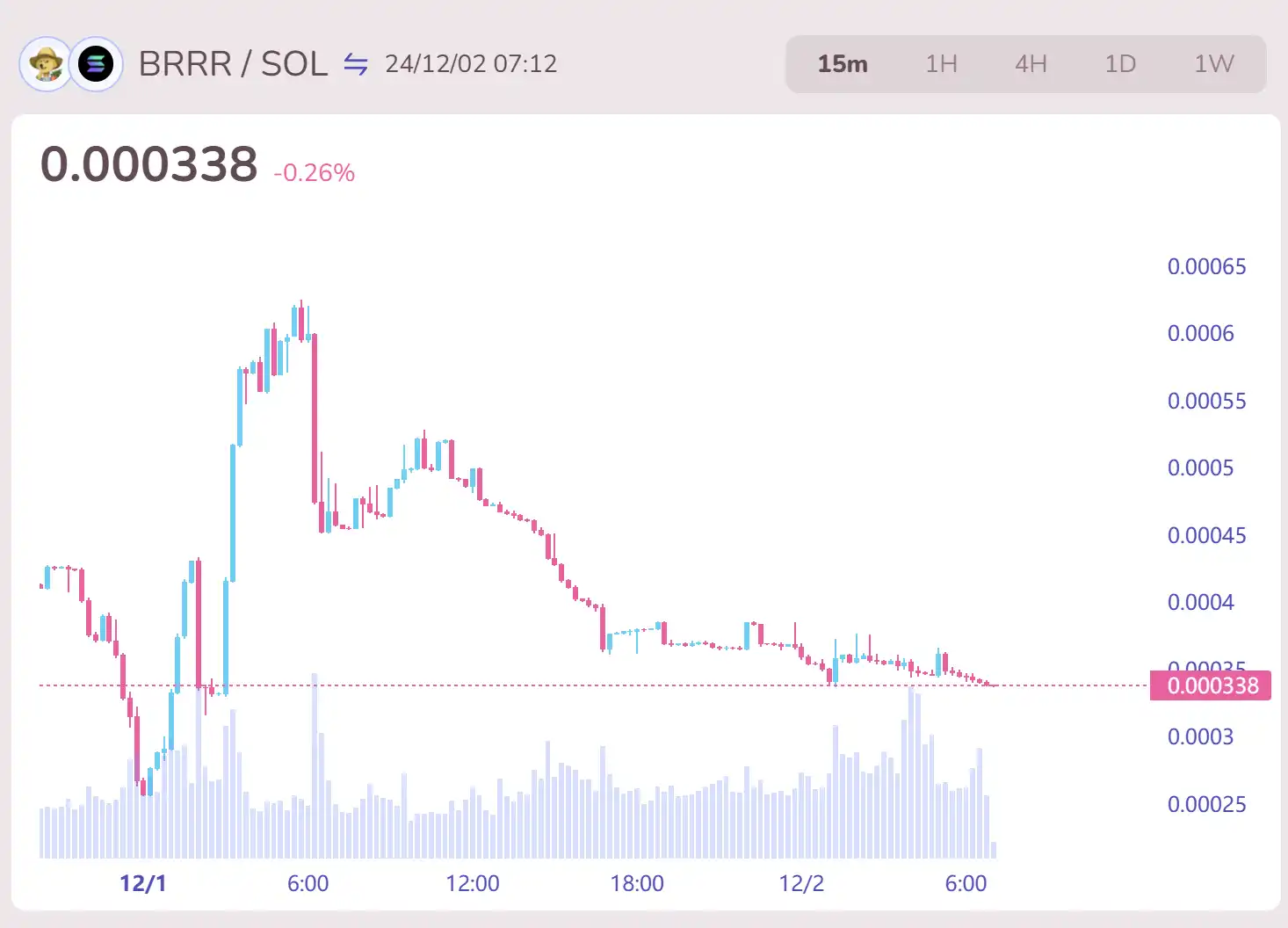 在早期,APR 之所以较高,很大一部分原因是因为$BRRR 的涨幅也计算在内,所以在「挖提卖」后会造成一定的抛压。虽然在后期$BRRR 有回购计划,可惜的是目前$BRRR 已经开始走「圣诞树」。