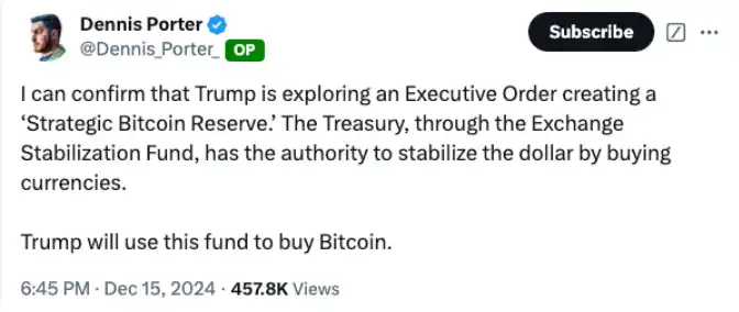 支持支持比特币的美国政策法案的非营利组织 Satoshi Act Fund 的联合创始人丹尼斯·波特 (Dennis Porter) 也认为,特朗普正在探索通过行政命令建立战略比特币储备。