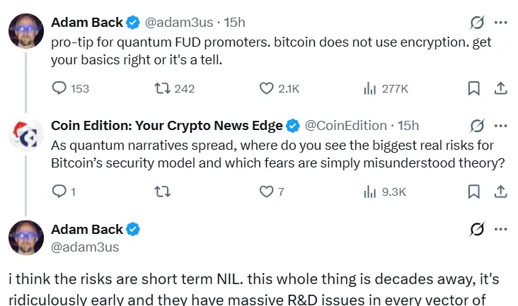 密码朋克、比特币基础设施公司Blockstream的联合创始人Adam Back在周四的一系列X帖子中表示,让比特币(BTC)“量子准备”是有益的,但在未来几十年内不会构成威胁,因为这项技术仍然“荒谬地早期”,存在研发问题。