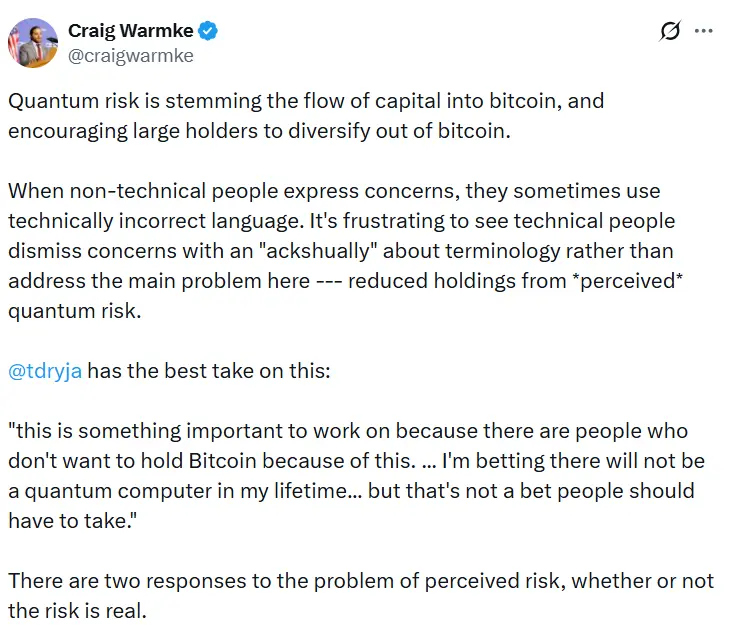 “当非技术人员表达担忧时,他们有时会使用技术上不正确的语言,”他说,并补充说,“看到技术人员否认担忧而不是解决‘感知到的量子风险导致的持币减少’问题令人沮丧。”