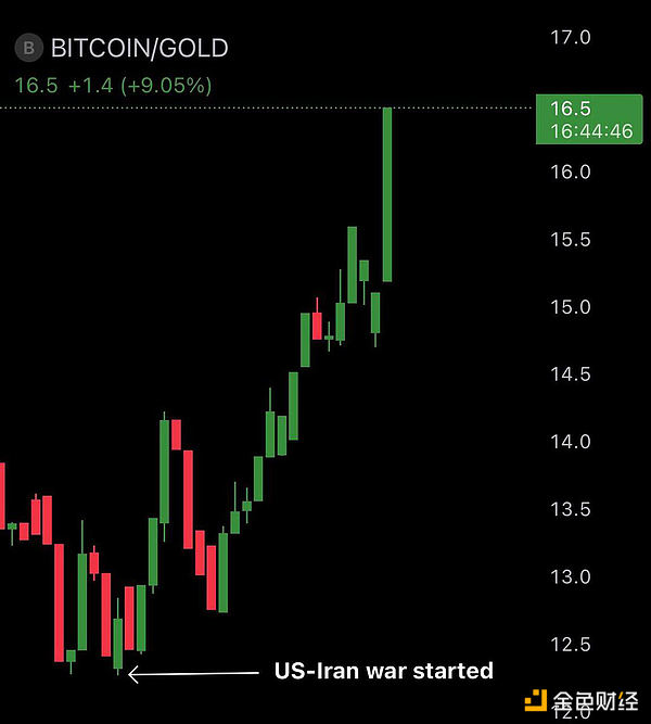 这就引出了比特币。这款加密货币成为了本次冲突中被忽视的赢家。Ash Crypto数据显示:“美伊冲突爆发23天以来,比特币相对黄金涨幅达34%。