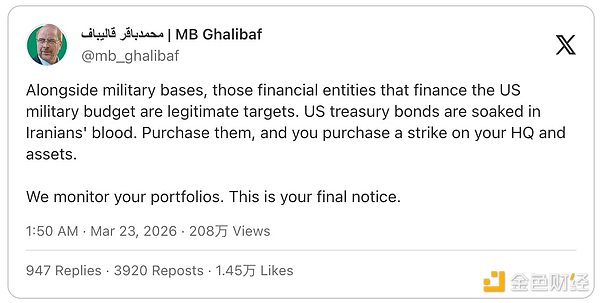 “除军事基地外,为美国军事预算提供资金的金融实体均为合法打击目标。美国国债沾满了伊朗人民的鲜血。购买这些债券,就等同于为自己的总部和资产招来打击。